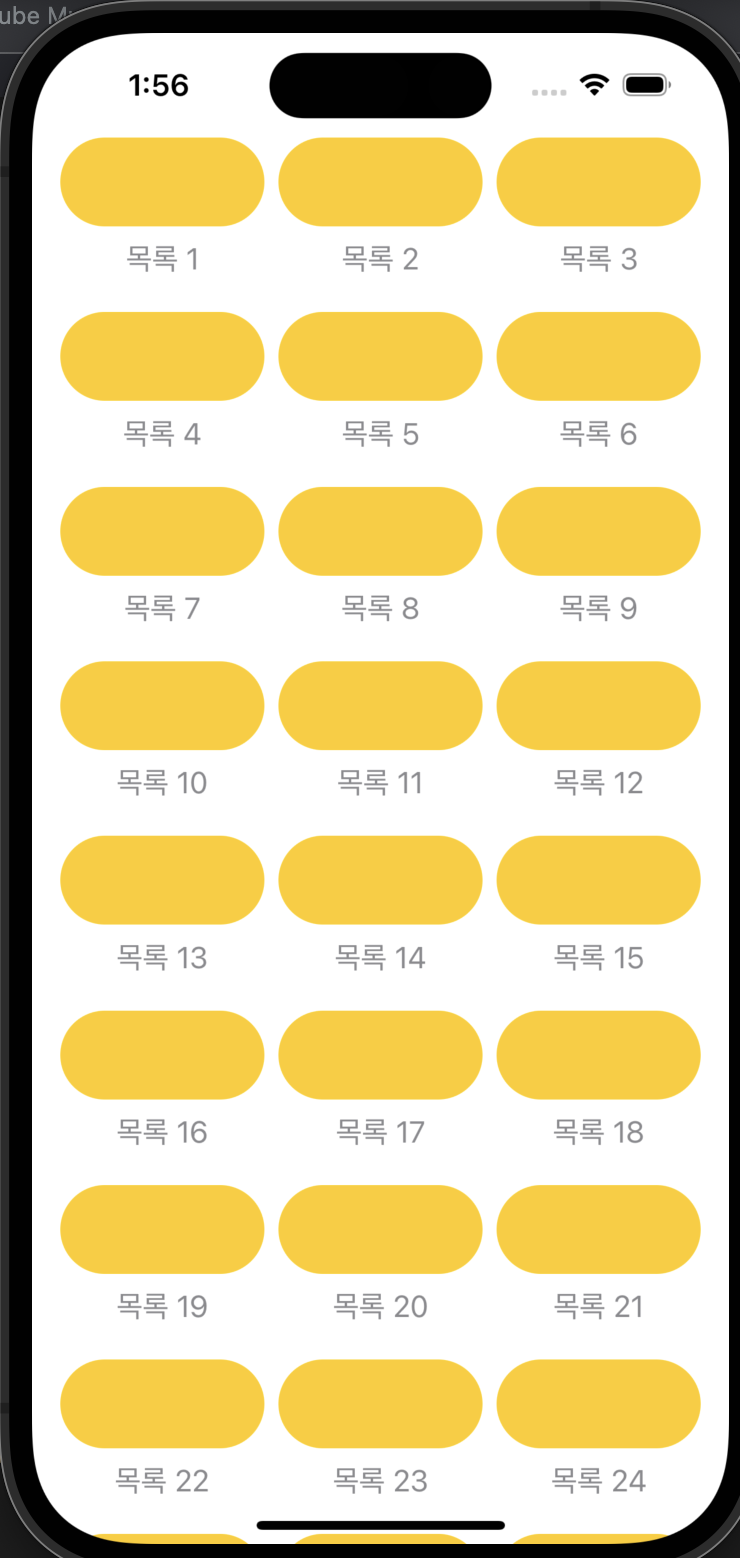 - GridItem(.adaptive(minimum: )) 레이아웃 최소 사이즈를 정한 후 화면을 그리드 형식으로 꽉 채울 수 있다. GridView 만 이용할 경우 화면을 초과한 경우 보이지 않기 때문에 ScrollView 도 추가한다.