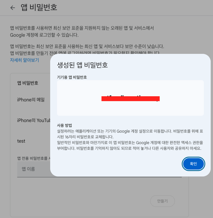 5. 이동한 화면에서 앱 이름에 아무 문구나 입력 후 [ 만들기 ] 버튼을 클릭하면 앱 비밀번호가 생성되면서 팝업창에 표시된다. 이 앱 비밀번호는 스프링부트에서 smtp 설정을 위해 필요한 비밀번호 이기 때문에 따로 적어둬야 한다.