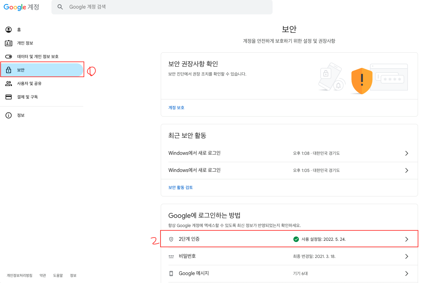 3. 왼쪽 메뉴에서 [ 보안 ] 을 클릭 후 오른족에 나타난 보안 화면의 [ 2단계 인증 ] 을 클릭한다.