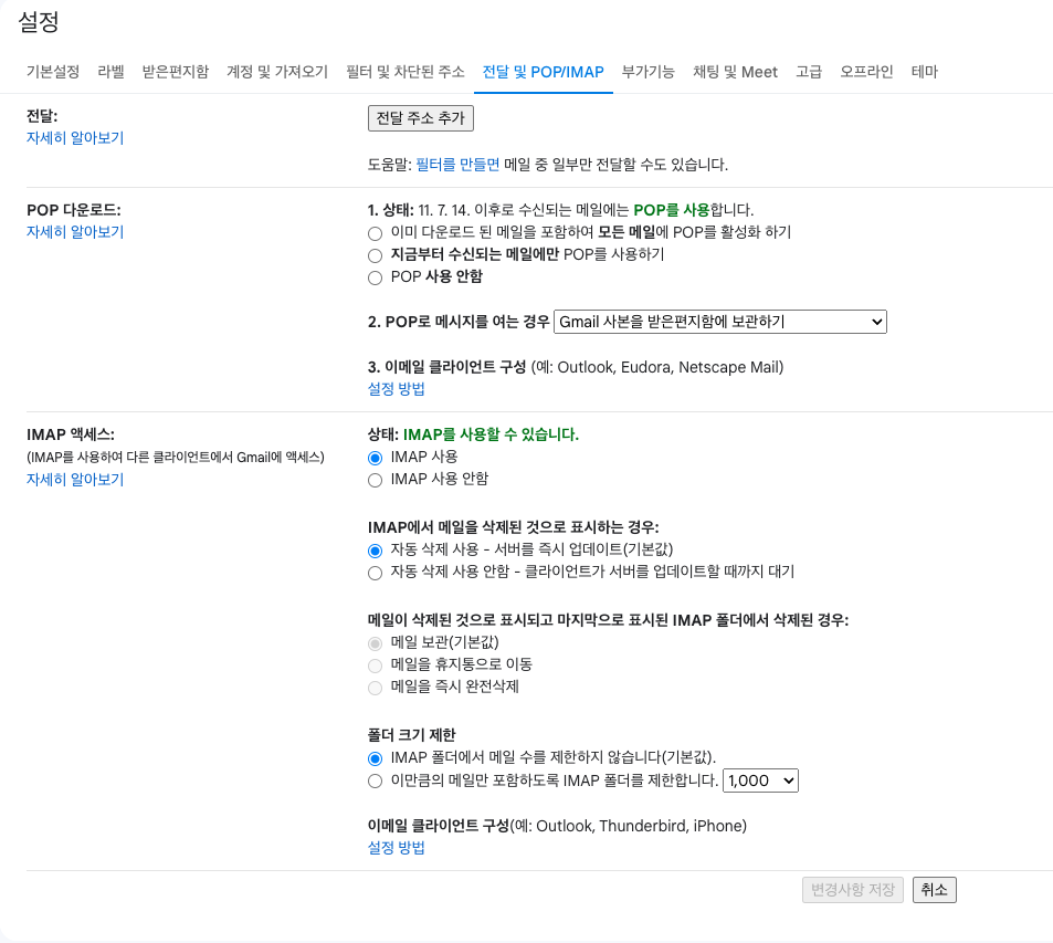 5. 설정 제목 밑에 [ 전달 및 POP/IMAP ] 메뉴를 클릭한다.