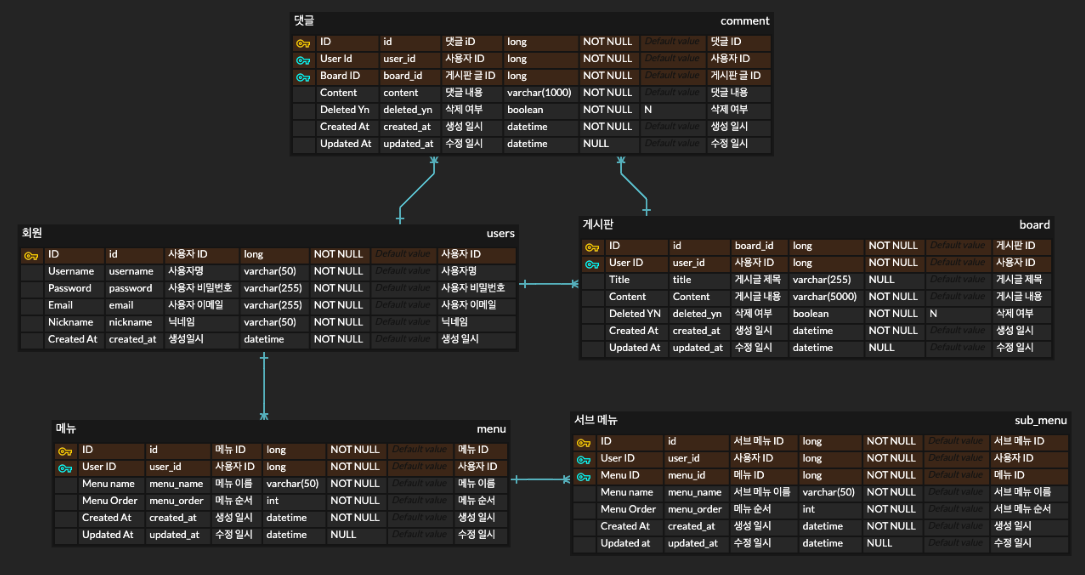 화면을 대략적으로 짜면 데이터를 저장할 데이터베이스의 테이블 구조도 설계를 해야 한다. 테이블 구조를 짤 때는 처음부터 잘 계획하고 짜야한다. 이 구조가 바뀌어버리면 개발하는 중에 테이블 구조의 변경으로 오류가 날 수 있다. 테이블 구조를 짤때는 draw.io 사이트를 이용해 작성하거나 ERD를 그릴 수 있는 사이트를 이용해 그린다. mysql workbranch 프로그램도 있지만 나는 웹에서 언제든 보고 수정할 수 있게 하기 위해 아래의 사이트를 이용했다.