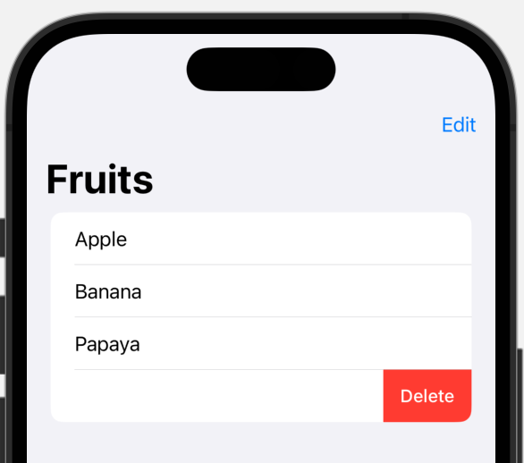 SwiftUI는 컬렉션에서 객체를 삭제하는 방법을 제어하는 데 사용할 onDelete() 수정자를 제공한다. 이 기능은 목록에서 각 행에만 사용된다.